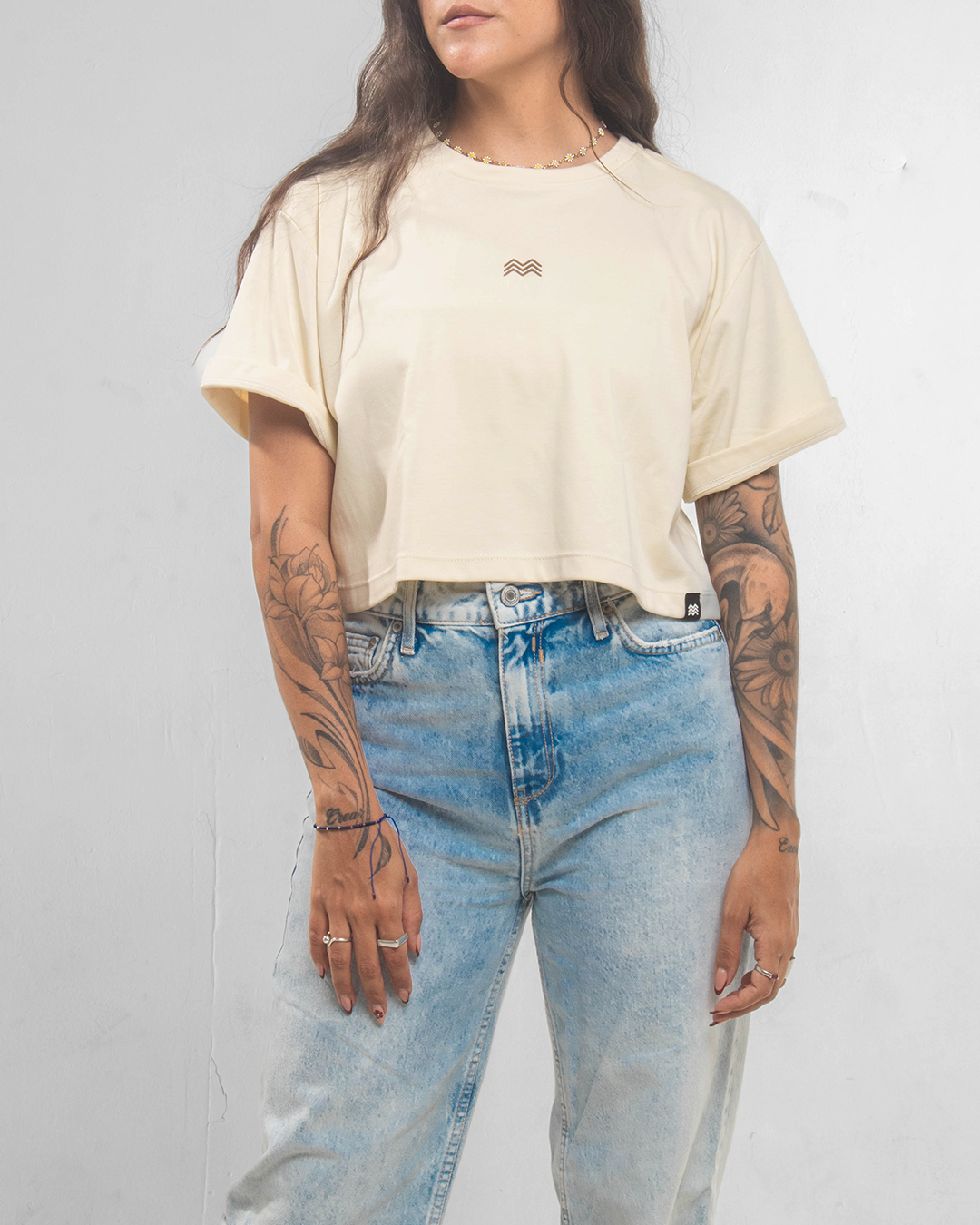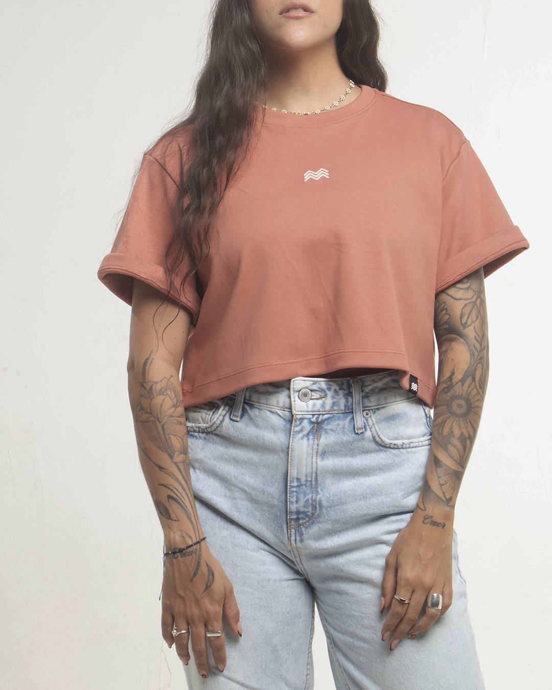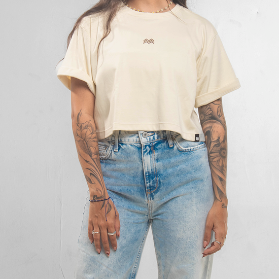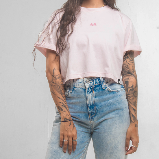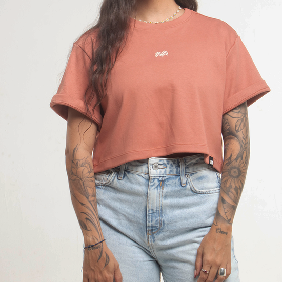 ☰ Descripción: Camiseta crop silueta oversized, cuello redondo, manga corta, logo en serigrafía de alta densidad en centro frente.