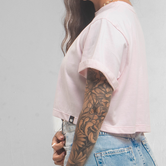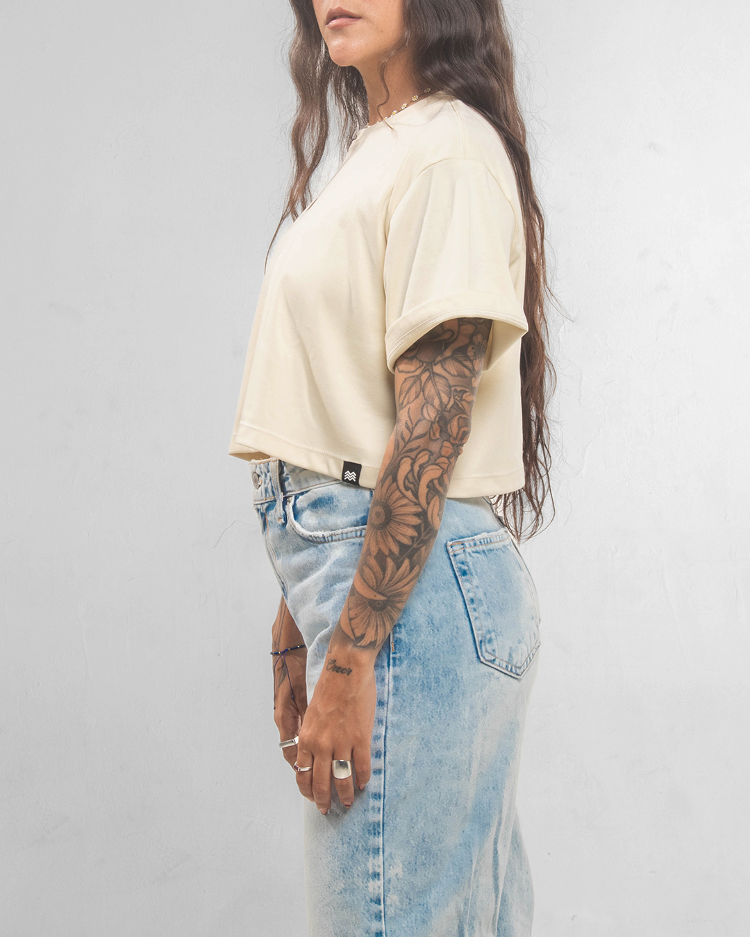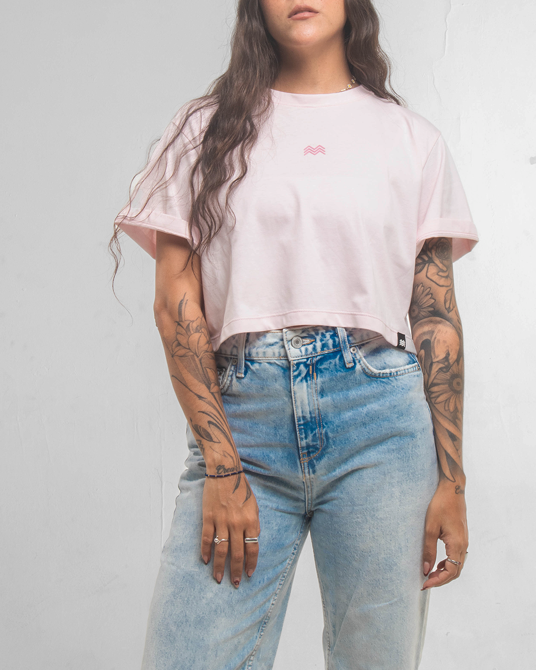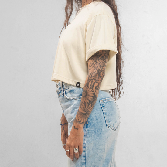 ☰ Descripción: Camiseta crop silueta oversized, cuello redondo, manga corta, logo en serigrafía de alta densidad en centro frente.